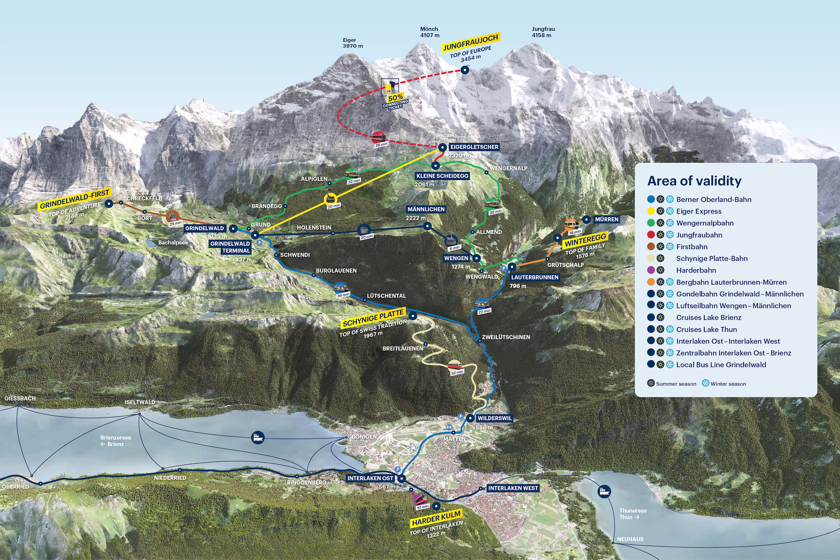 The Jungfrau Travel Pass coverage is best explained by the map below: