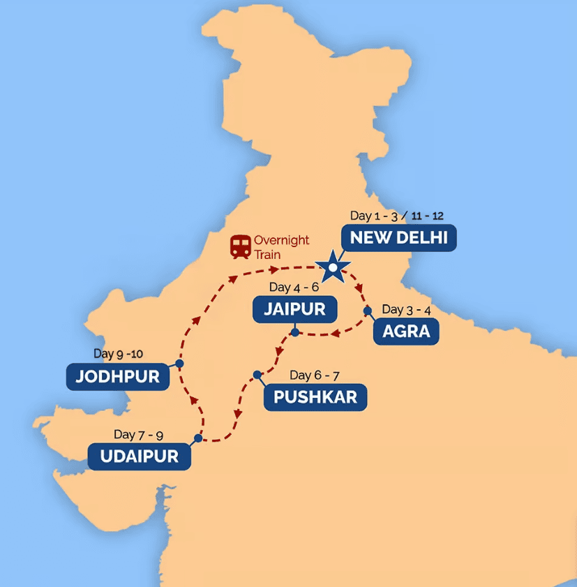 India Classic itinerary: 12 days/11 nights starting in Delhi, covering the Golden Triangle (Delhi, Agra and Jaipur) before heading deeper into Rajasthan to Pushkar, Udaipur and Jodhpur, with an overnight train back to Delhi at the end. They also offer a shorter 6-day India Snapshot tour which ends in Jaipur if you’re pressed for time.